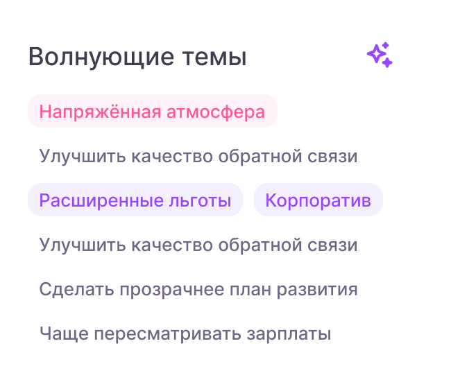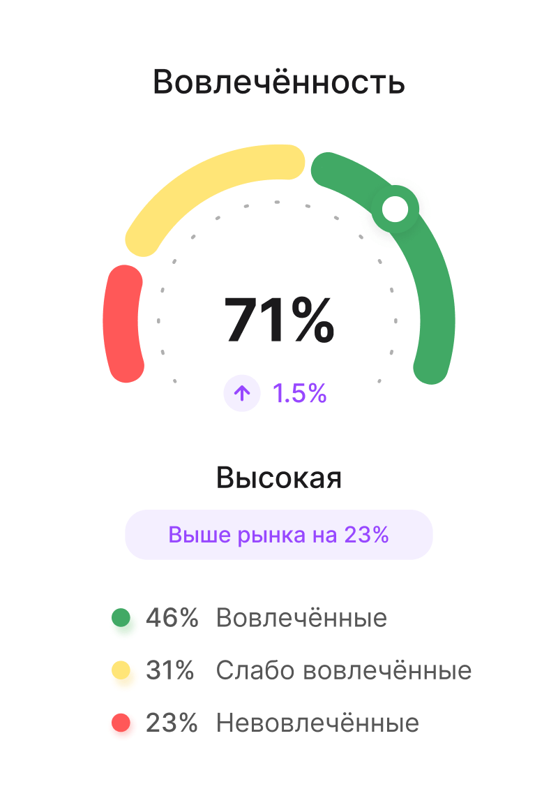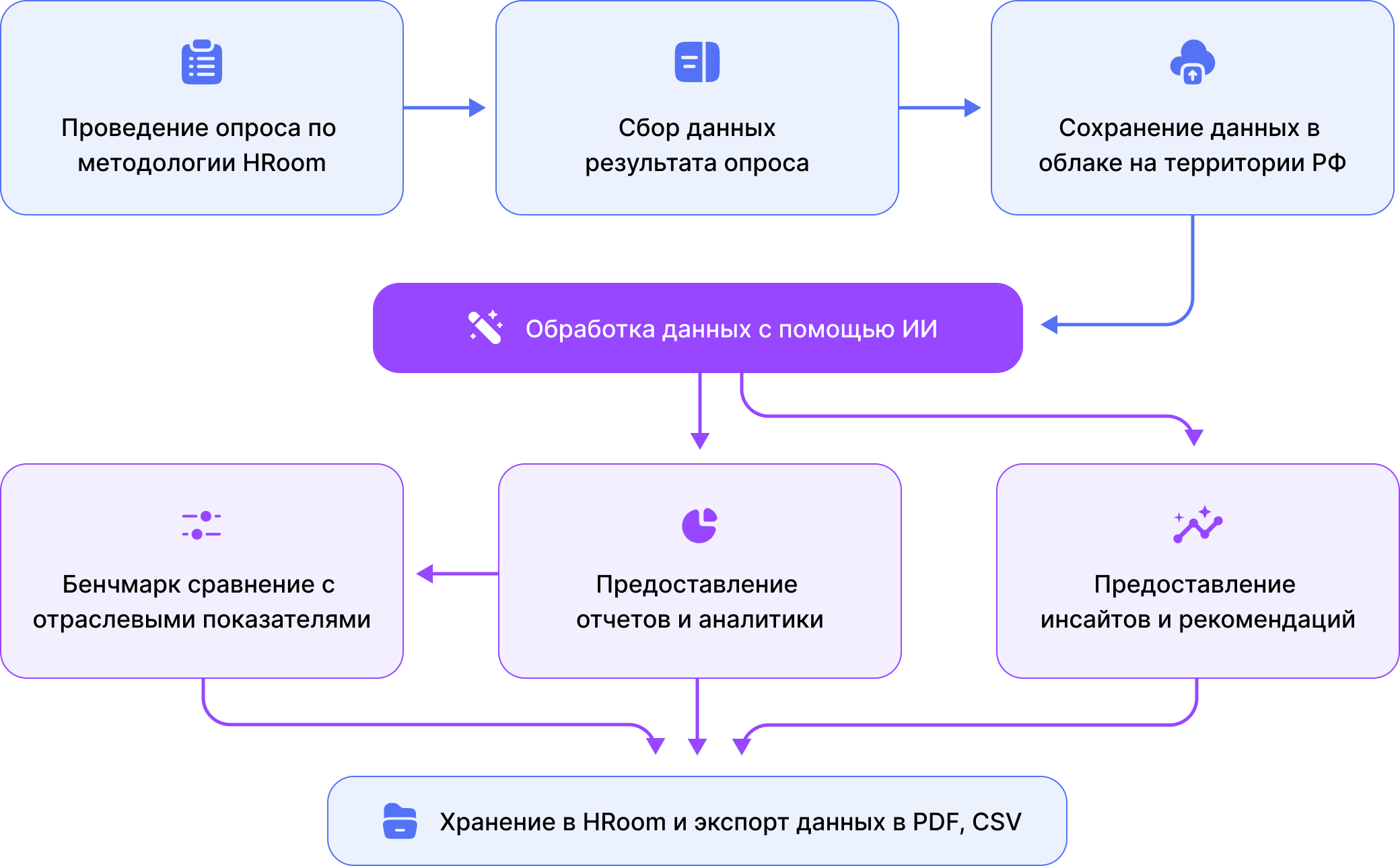 Благодаря автоматизированному анализу данных с помощью ИИ мы помогаем HR-специалистам отказаться от ручного труда, предоставляем персонализированные рекомендации и советы по повышению вовлеченности, удовлетворенности и эффективности сотрудников